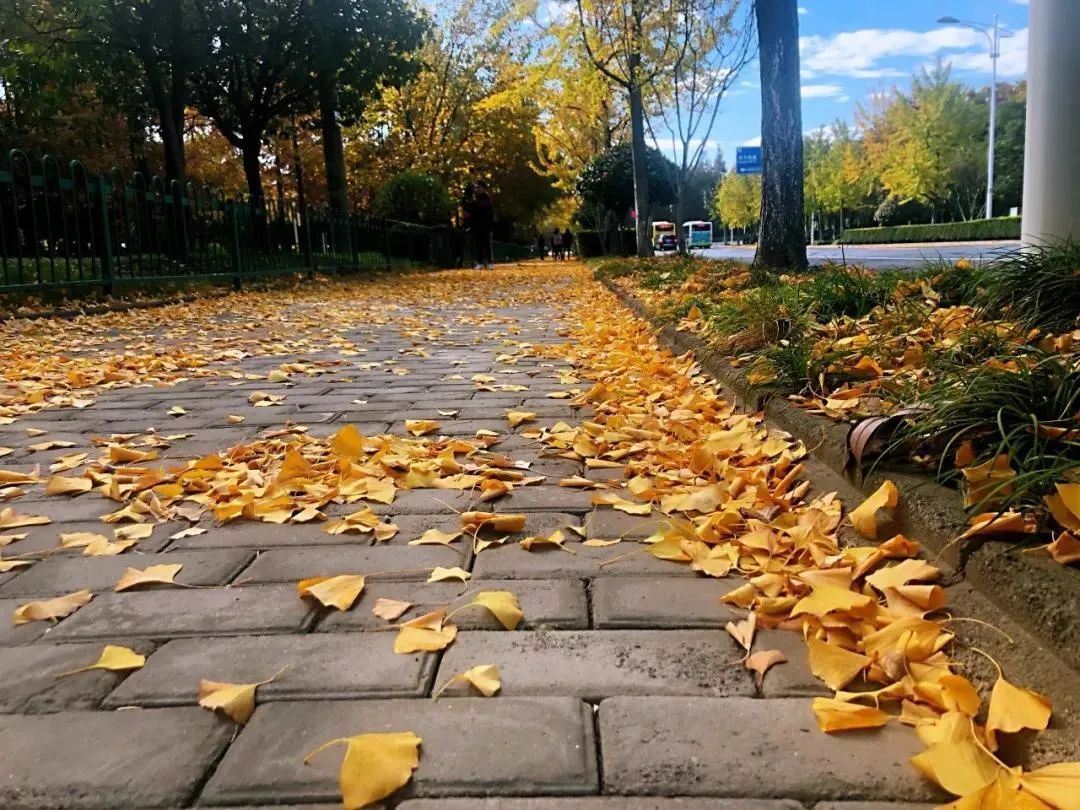看金黄的树叶铺满地面,