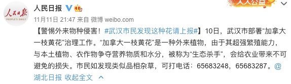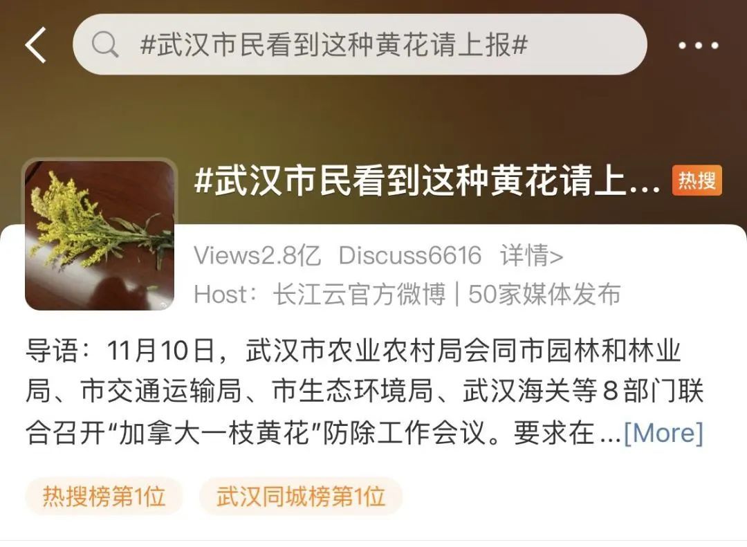 原来,近日武汉市农业农村局等8部门联合召开了“加拿大一枝黄花”防除工作会议,要求在11月20日前完成包括农田、道路、风景区等全市地面上的防除任务,有效控制扩散蔓延和危害影响。会议还要求,若市民外出发现类似品相的杂草,可拨打电话“举报”——(65683248,65683287)