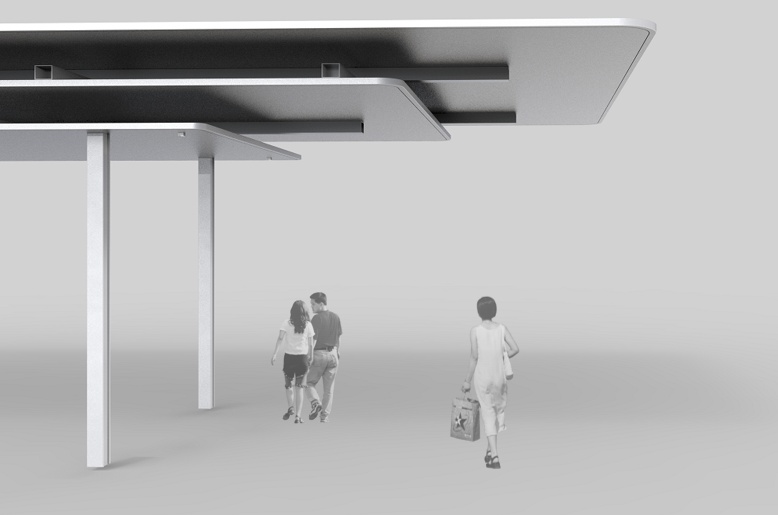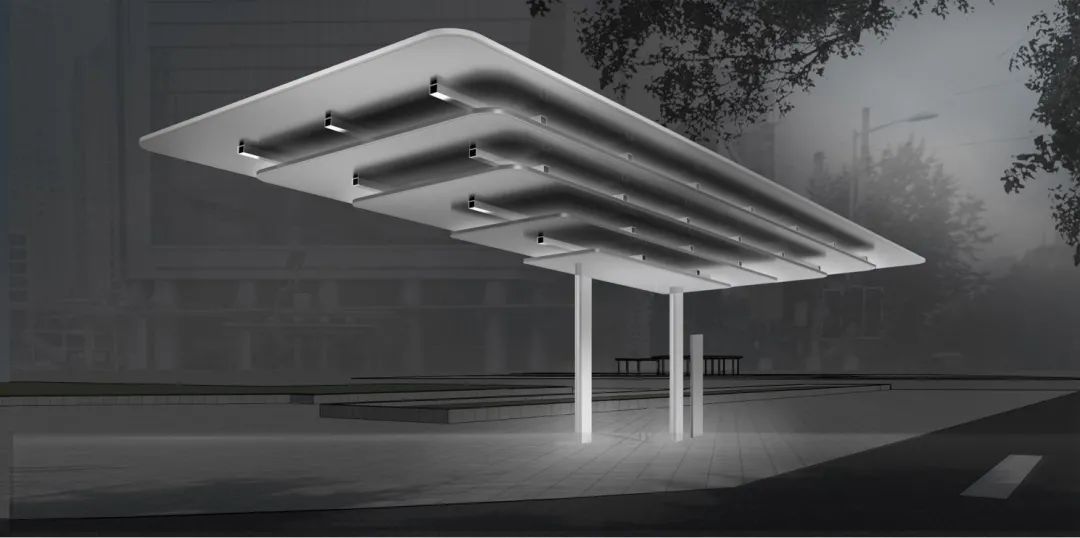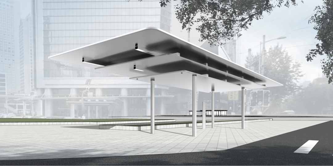 借鉴中国传统的斗拱形态,可伸缩变化的顶棚在满足遮阳功能的前提下,呈现出艺术装置的质感,力求打造独具特色具有网红打卡效应的“地标式遮阳棚”。
