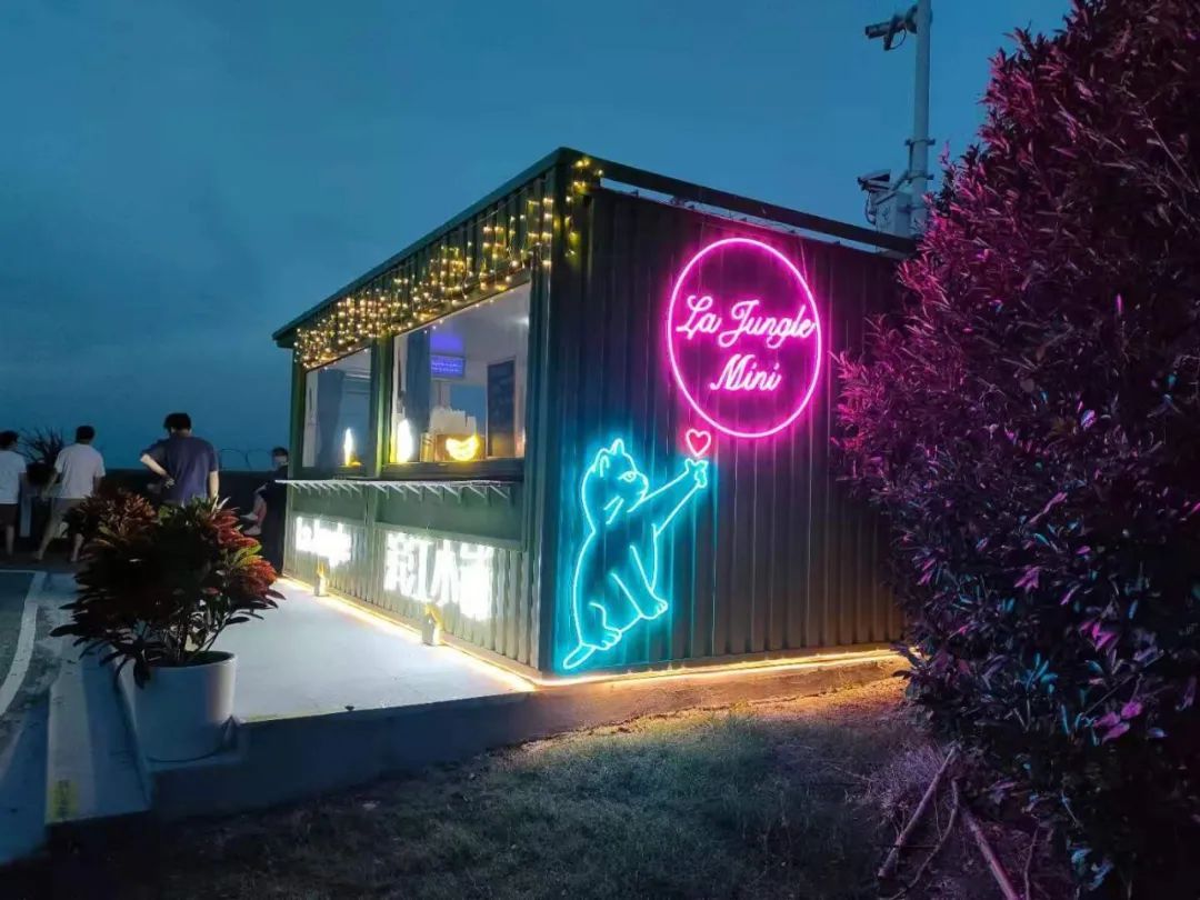 入夜后,集装箱外五彩的灯光亮起,可爱的猫咪正在向来往的行人发送爱心,你接收到了吗?