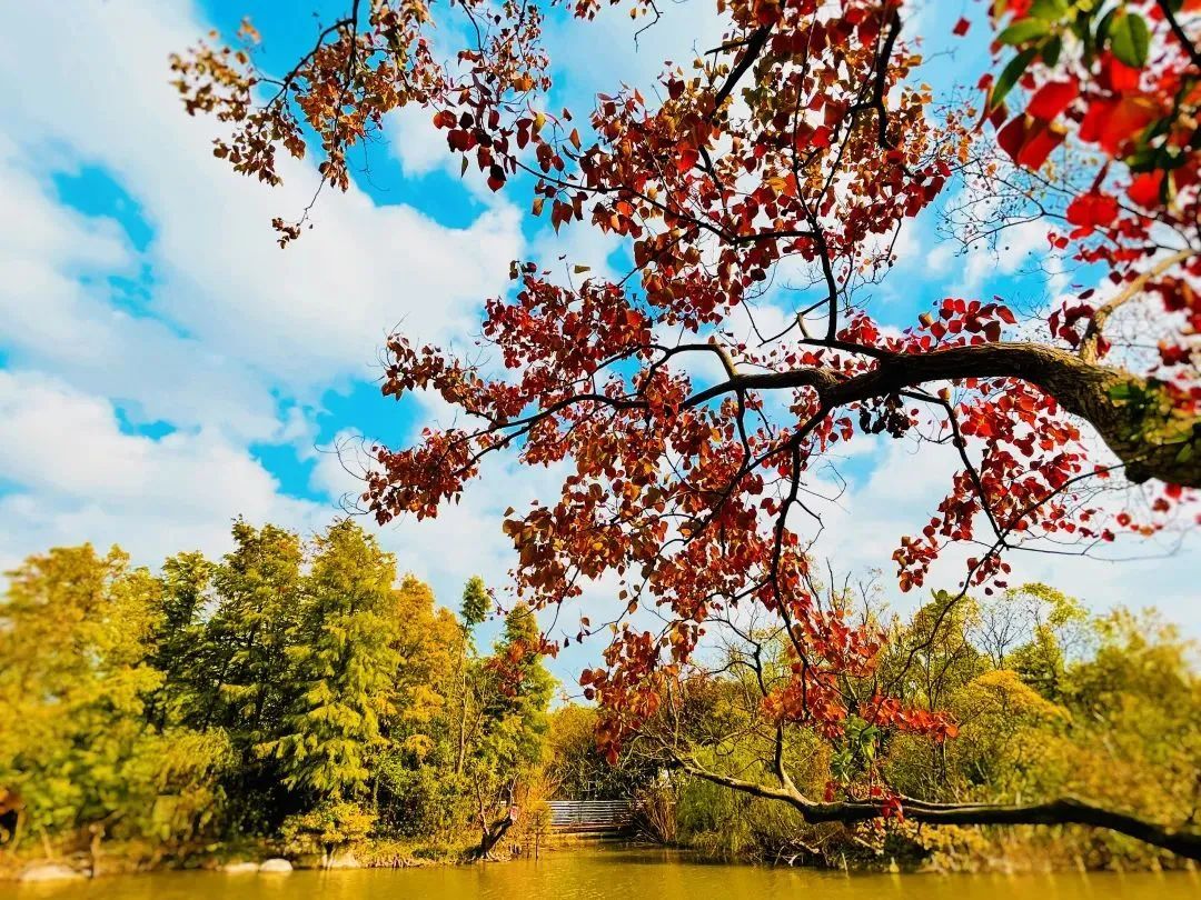 这个季节的上海吴淞炮台湾国家湿地公园美得正当时,橙红的榉树、枫香,橙黄的乌桕,灿黄的马褂木、银杏、无患子,枝头鲜亮的彩叶与散落地面的落叶相互辉映,各种秋色叶树已陆续褪去绿意,变幻成五彩斑斓的模样。