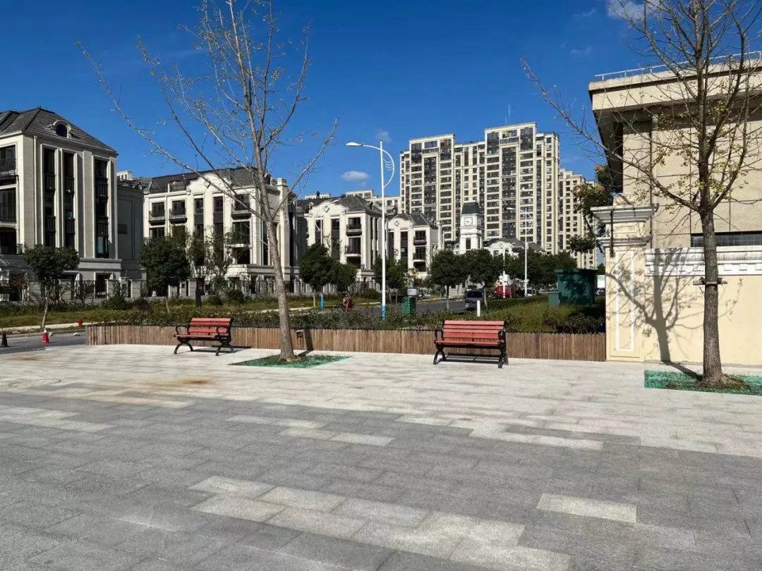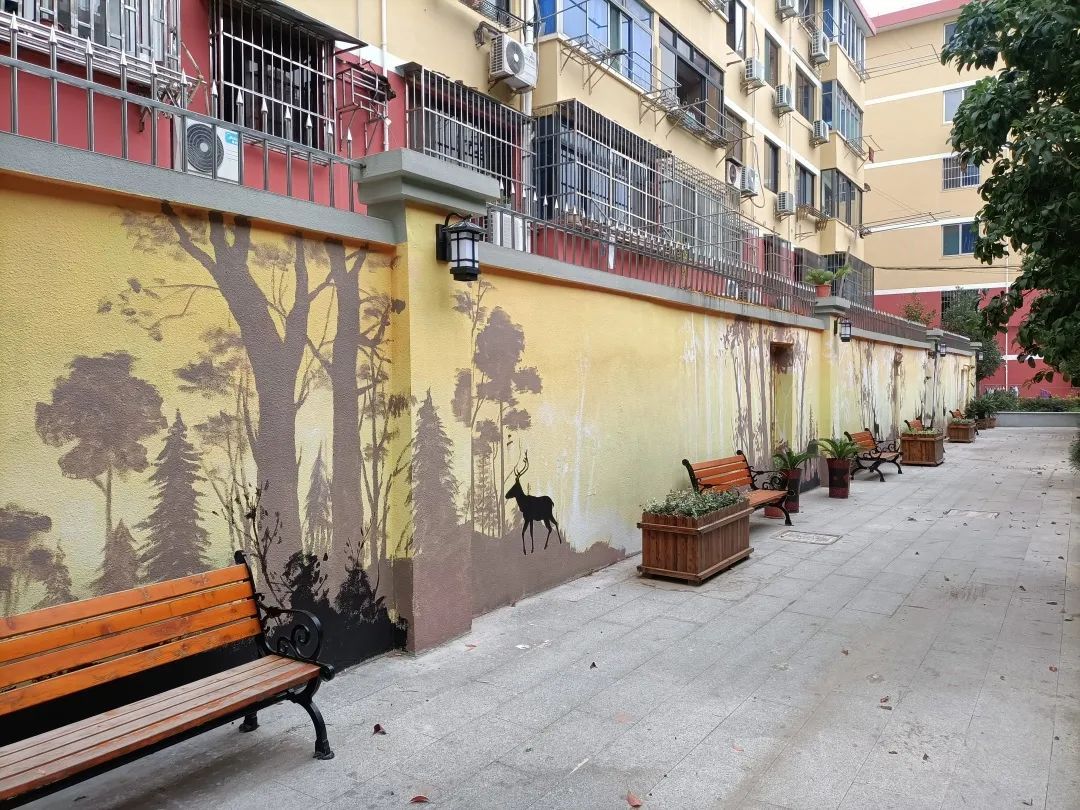美丽街区景墙、长椅、雕塑、绿植构成一幅美丽街景,打造成为居民“随处看景、随时可坐”的休闲街区,让居民切身感受到美丽街区改造带来的点滴变化。