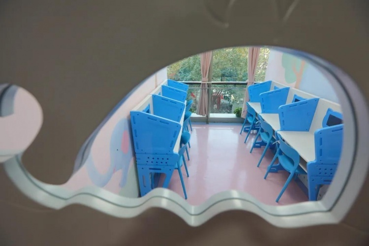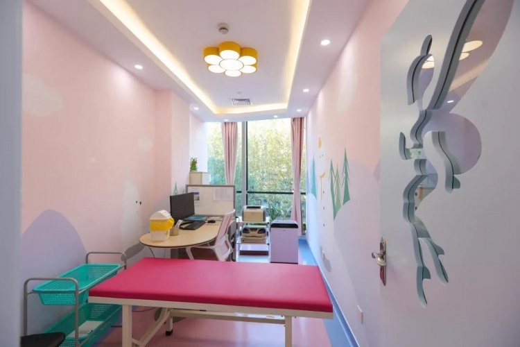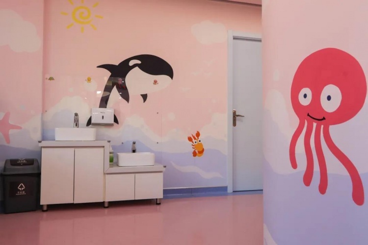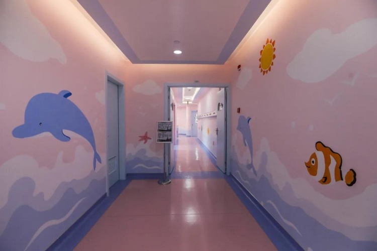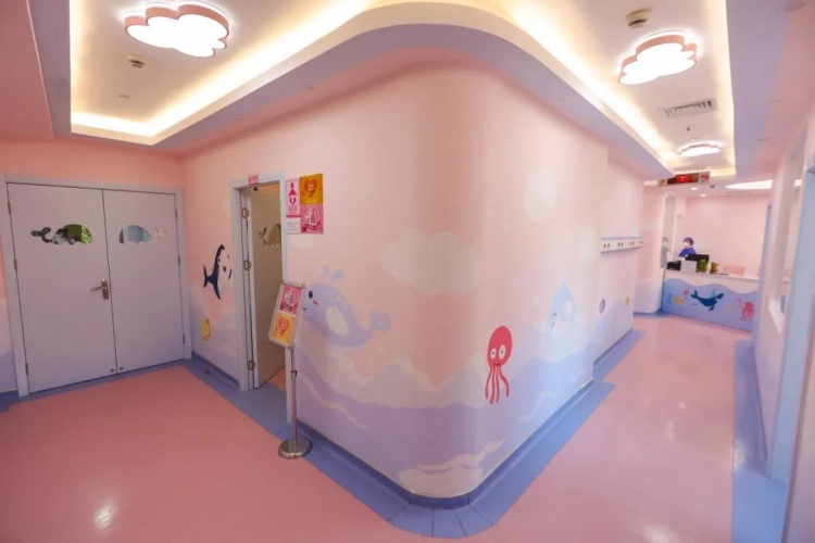 淡粉色的墙面上,有着海洋风格的卡通画——鲸鱼、水母、灯塔……淡蓝色的诊室门上,则有着卡通形状的镂空玻璃。