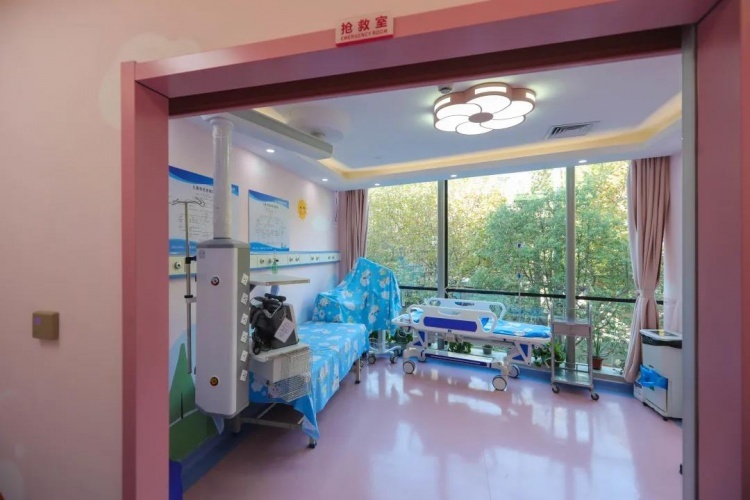 这里还有为儿童单独设立的抢救室,电动门、抢救床、除颤仪等,都是为儿童量身定制的特别款。抢救室和旁边的护士台连通,一旦有需要,医护人员能够以最快的速度完成抢救措施。