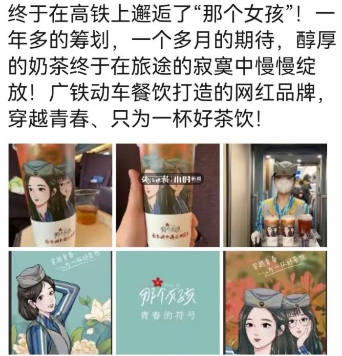中国铁路广州局集团有限公司广州动车组餐饮公司率先推出了高铁奶茶。每一杯高铁奶茶的包装上,印的都是高铁餐饮乘务员形象,取名“那个女孩”。