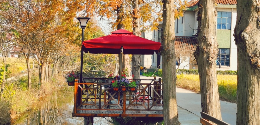 除此之外,民宿还配有KTV、健身房、茶室等娱乐设施。这个时节,你来谣歌,周边都是黄灿灿的稻田,清风徐来,麦浪飞舞。村民院落里还能看见柿子树、橘子树挂着红艳艳的果实,很是诱人。村口有个村民公园,一条崭新的跑道,铺满颜色各异的落叶,背景是郁郁树林,美得像幅油画。