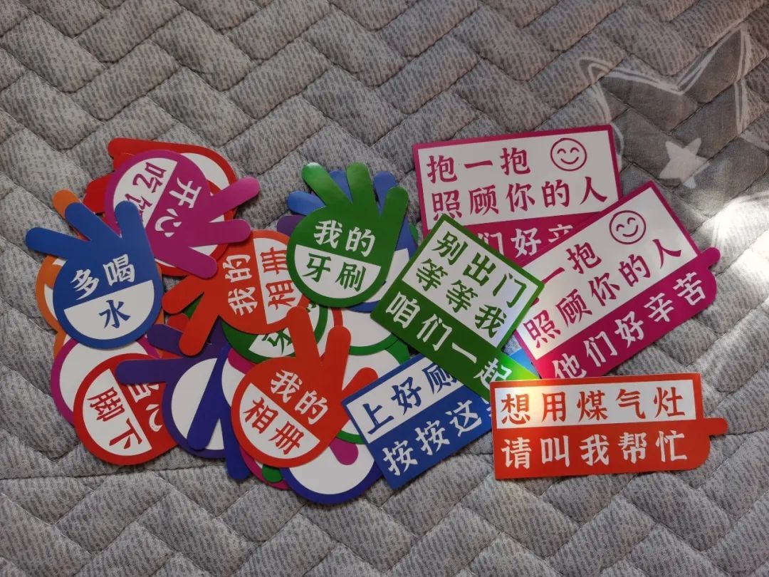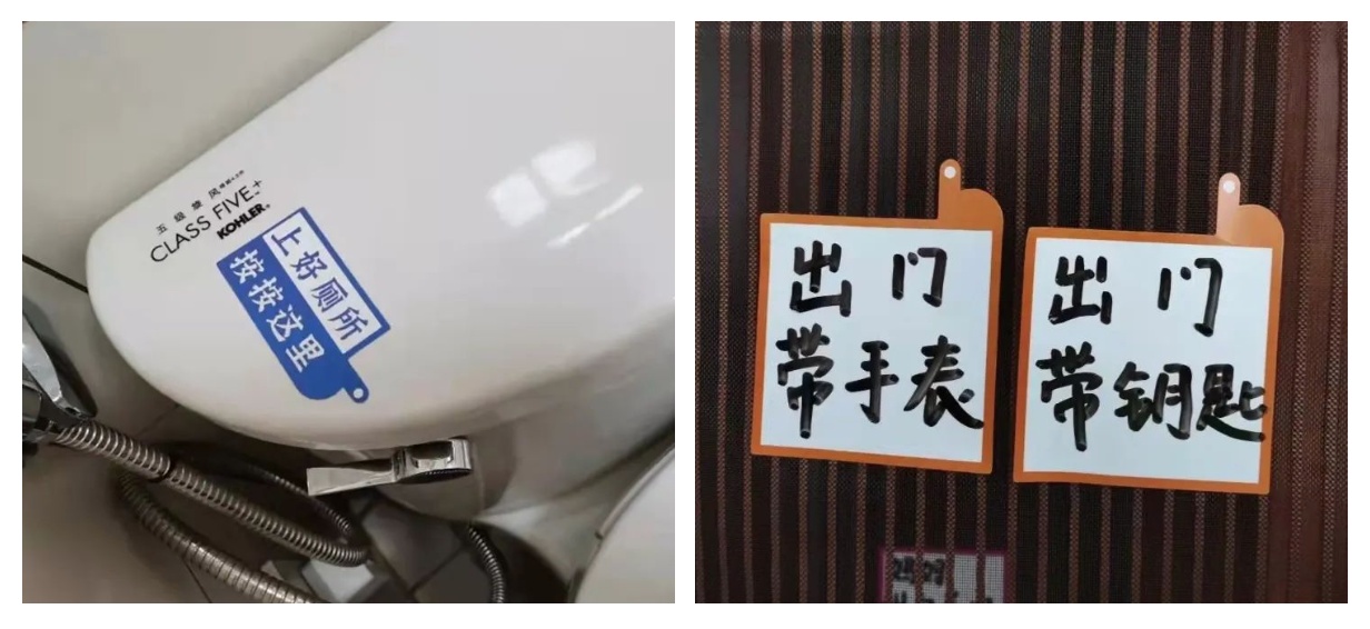 “原先妈妈走丢过2次,我就给她买了能定位的手表,让她出门一定戴着。所以有时她看到门上贴着的‘出门带手表’才会想起来,然后重新拿好再出门,这样我就很放心。”提到专为认知障碍老人设计的提示标签,郑阿婆的女儿十分满意。