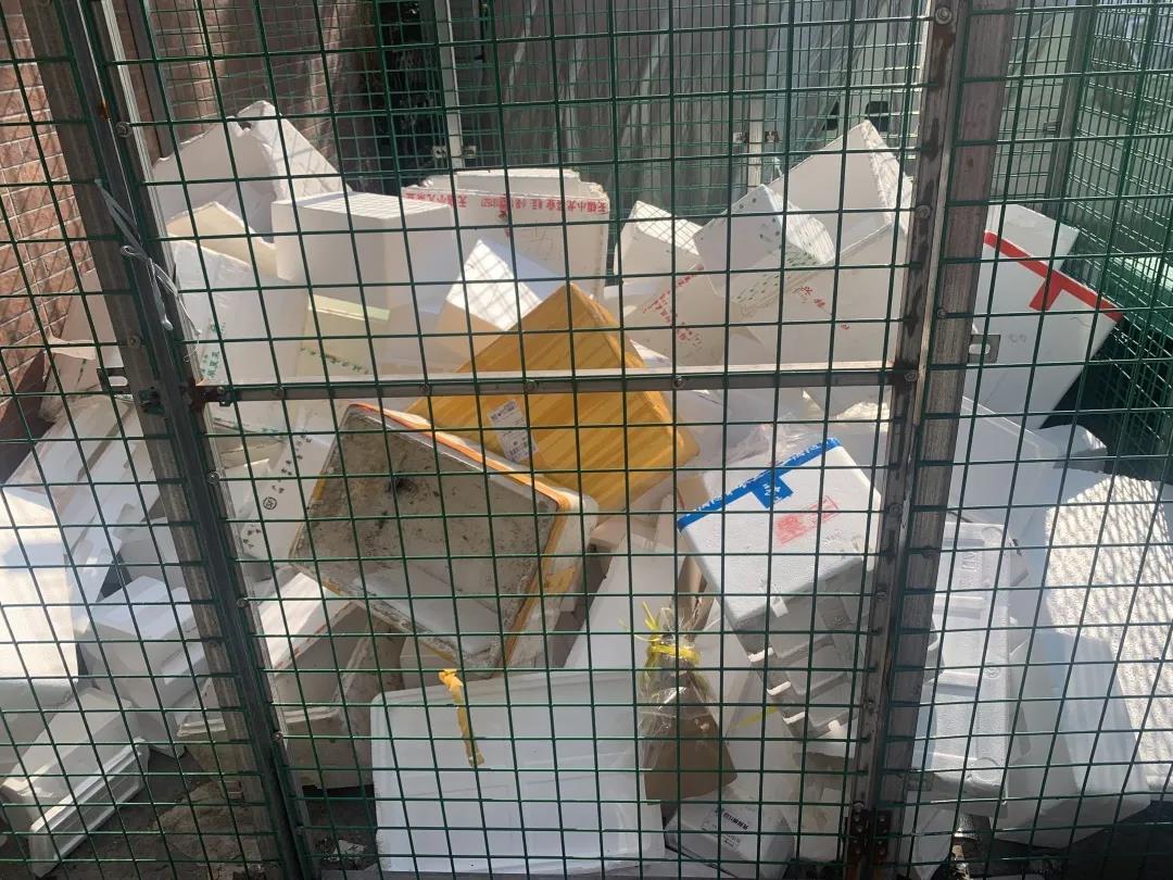 在小区垃圾厢房的一侧空地上,记者一眼就看到了这间“铁丝房”。“铁丝房”一面靠墙,另外三面由三张绿色铁丝网组成,约两米高并且没有封顶。约6平方米的空间内,正堆放着不少废弃泡沫塑料箱。