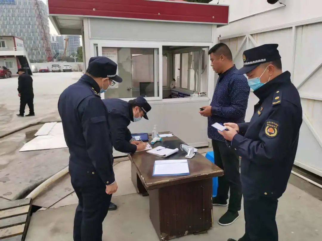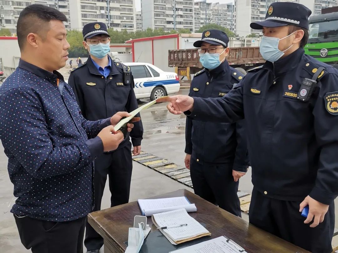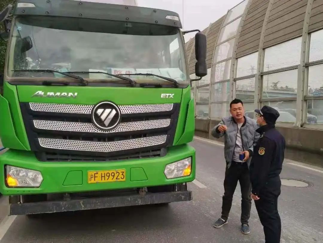 在巡查过程中,执法队员发现辖区内的虹梅路上有渣土散落的痕迹,遂拦截了几辆渣土车,拍照取证,询问司机得知其工地所在地为徐汇区虹梅路街道,于是古美中队城管执法队员立即联系徐汇区虹梅街道综合行政执法队,一同前往工地进行联合执法。