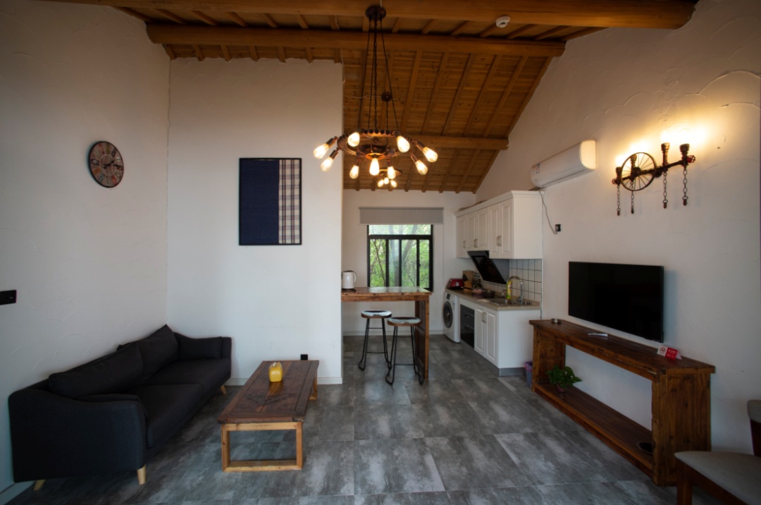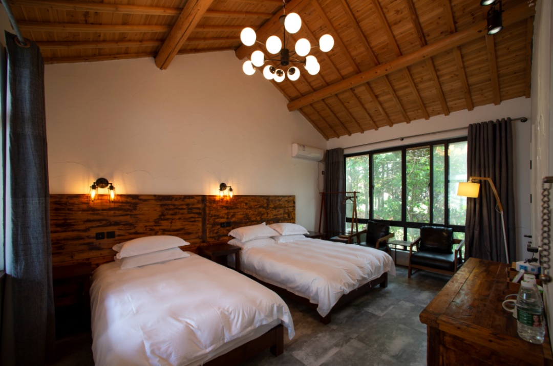 民宿一共有29间客房,由本地居民的老建筑改造,散落在幽静美丽的仙桥村中,推门就能感受到乡村宁静安逸的气息。室内装修注重设计感,但是又尊重房原貌,保留了房间的屋顶木梁,白墙黑瓦,面积巨大的黑框窗户,不仅提升了房间的采光率,而且让整栋建筑更具现代感。屋内装饰以木质为主,回收的旧木门板,用木油和涂料重新改造,配上斑驳的墙壁,有了别处无可比拟的原始美感。仙桥村目前已经有12幢创意民宿陆续对外迎客,使游客切实感受到田园生活魅力的同时体验别样的乡村时尚。
