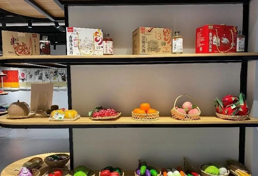 农:陈列生态健康农产品,其中包括各种蔬菜、大米、水果、农家的鸡鸭鹅和蛋类产品、羊肉猪肉等,并提供游客订购服务。工:展示多个崇明本土企业的优质国货,如福太太女装、瀛春毛纺织等,均瀛致力于将崇明优质国货展现于更多的平台。商:主要依托崇明土布为基础,出售常规土布制品如土布衣服、土布鞋包、土布玩偶的同时,也为有不同需求的客户进行私人订制服务,创造属于个人的个性化土布制品。