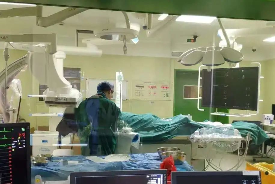 胸痛中心医师当即启动患者的心梗急诊手术绿色通道。病人被迅速护送至导管室,快速开始手术,进行动脉穿刺、血管造影,静脉用药并密切监测生命体征。