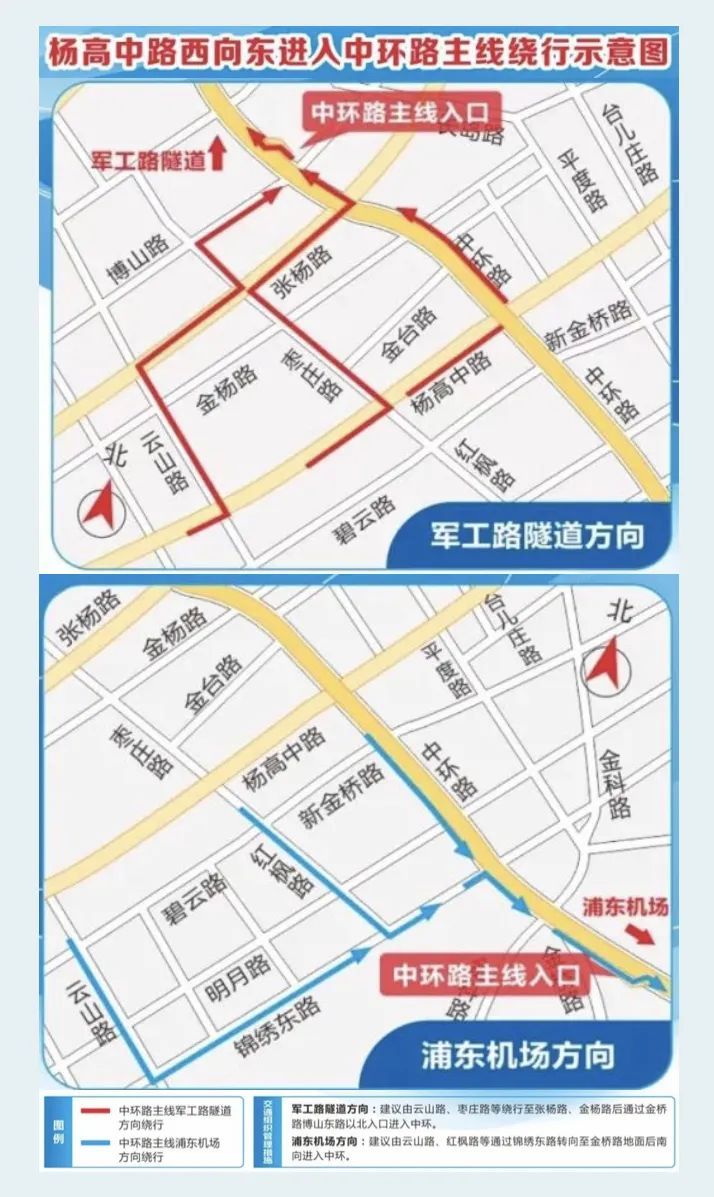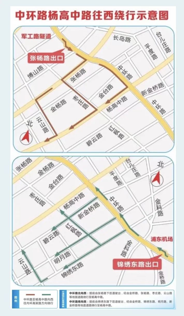 施工期间原途经下匝道驶出中环车辆需通过中环张杨路出口或锦绣东路出口,途经金桥路、张杨路、枣庄路、云山路、明月路、新金桥路、锦绣东路、红枫路等地面道路进行绕行。原途经上匝道进入中环车辆需途经金桥路、张杨路、枣庄路、云山路、锦绣东路、红枫路等地面道路绕行至中环张杨路入口或锦绣东路入口进入中环。