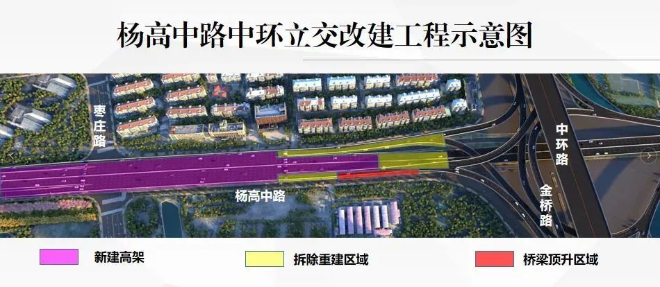 工程同步改造中环立交(涉及拆除改造北向西、西向北匝道和跨线桥),其中杨高中路(罗山路立交-枣庄路)段已于前期围场施工,本次施工范围为中环立交。详见↓