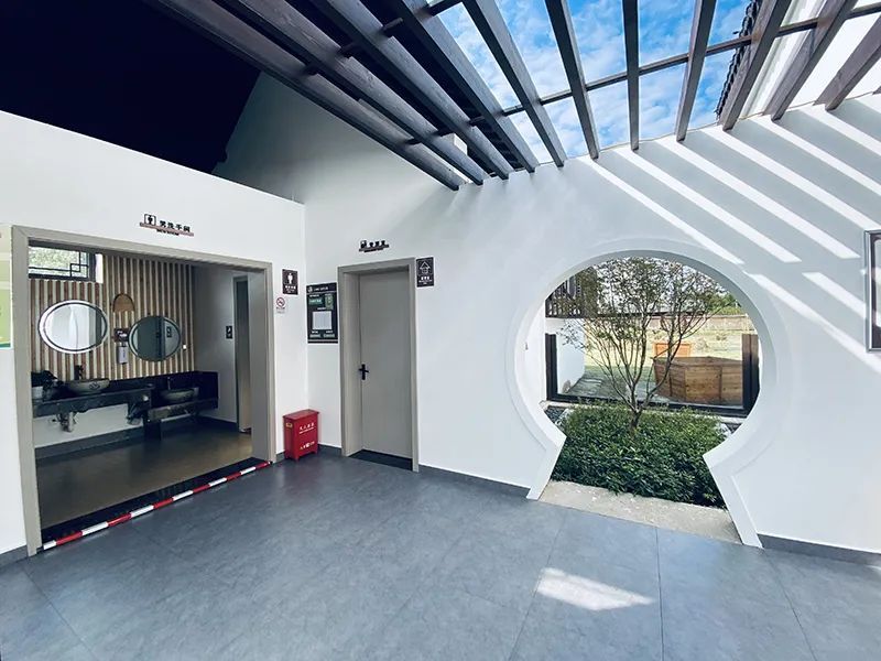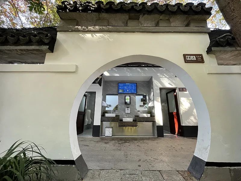 此外,该公厕利用科技赋能,终端显示屏、 坑位监测、智能报警、光氢离子化杀菌除臭等装置帮助实现公厕精细化管理;收集屋面太阳能源为洗手池热水和及户外地灯供能,结合海绵城市理念,屋面排水引导用作绿地灌溉。