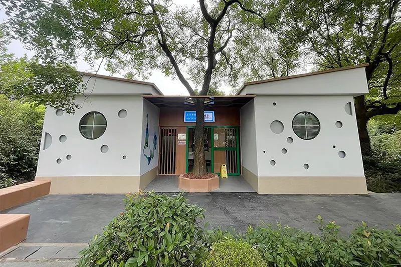 该公厕位于徐汇区天钥桥路零陵路东南角绿地内。因毗邻上海体育公园,公厕的外立面设计形似泳池的水浪,增加了夜间灯光效果,内部装饰上融入了如跑道、滑雪项目等体育元素。公厕的公共区域提供休息座椅,厕间内安装应急呼叫装置、挂衣钩,第三卫生间配备儿童安全座椅、托婴板。通过增加智能控制系统和空调新风系统,实时显示卫生间温度、可用厕位数量、空气质量等。这些暖心的设备让市民如厕更加温馨舒适。