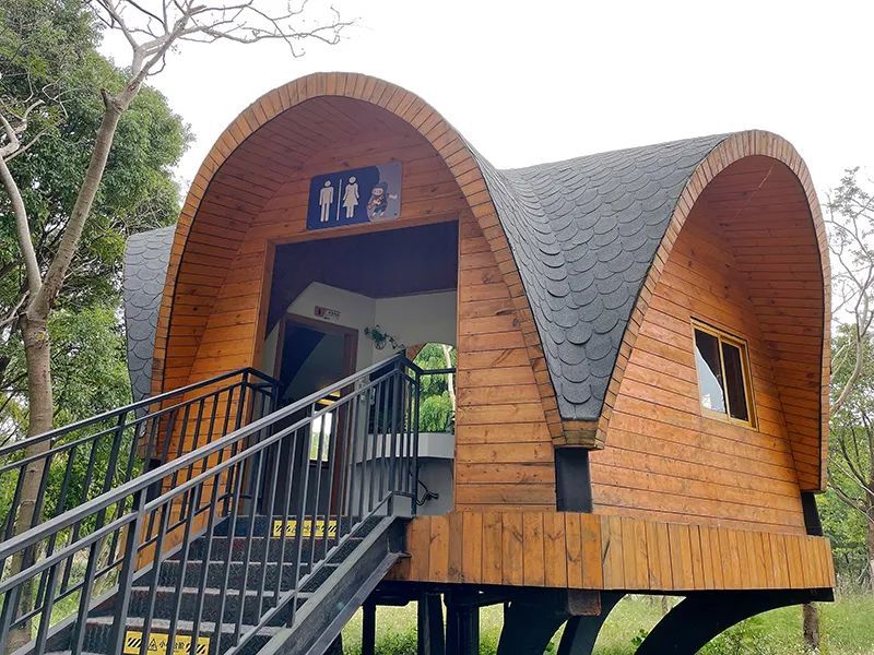 树屋位于漕泾郊野公园长堰路北面的树林间,厕所架空到2层,仿佛一座“树屋”,故取名树屋。厕所四面环抱绿色植物,与周围景色融为一体。内部设计凸显人文关怀与绿色环保,各种指示标志齐全,配有洗手液、消毒液、面镜等设施,为游客提供更方便,更完善的如厕体验。