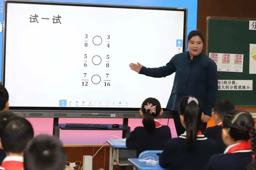 杨浦区平凉路三小的张智玮老师正在上一堂《分数大小比较》的课,这一课时主要让学生学会如何来比较分母不同,分子相同分数的大小。