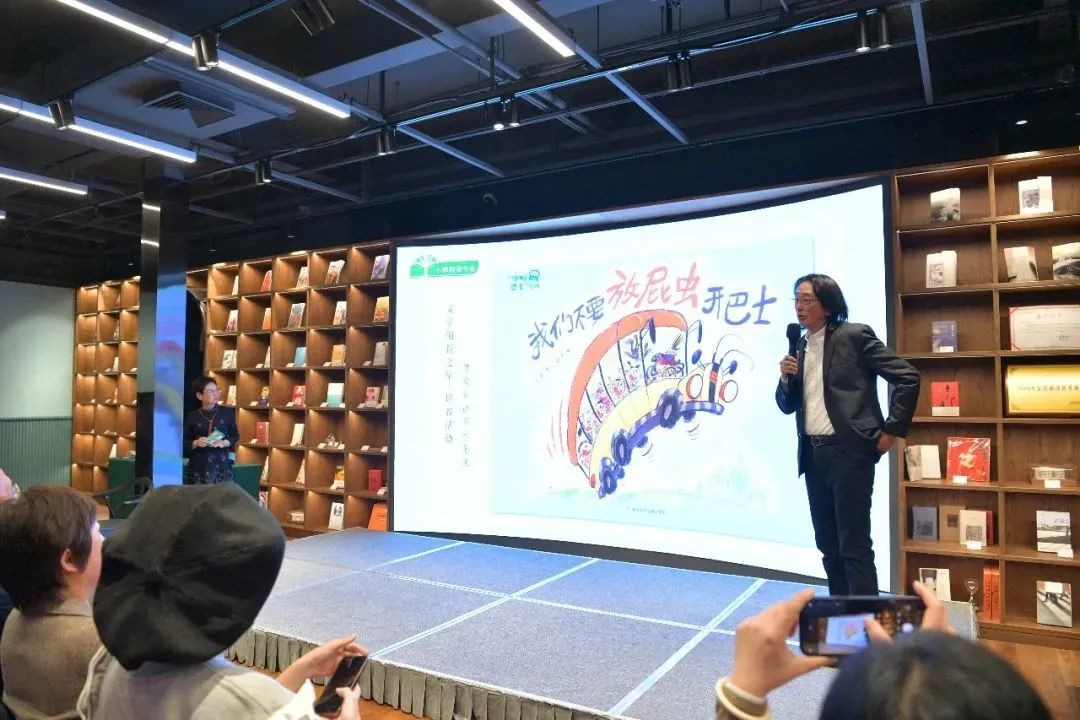 善于创作不同风格作品的彭懿凭借《我们不要放屁虫开巴士》获得了图书优秀作品奖。他告诉在场的大小读者,这是一本荒诞的图画书,并没有什么教育意义,创作的初衷就是让孩子们的想象力狂奔起来。