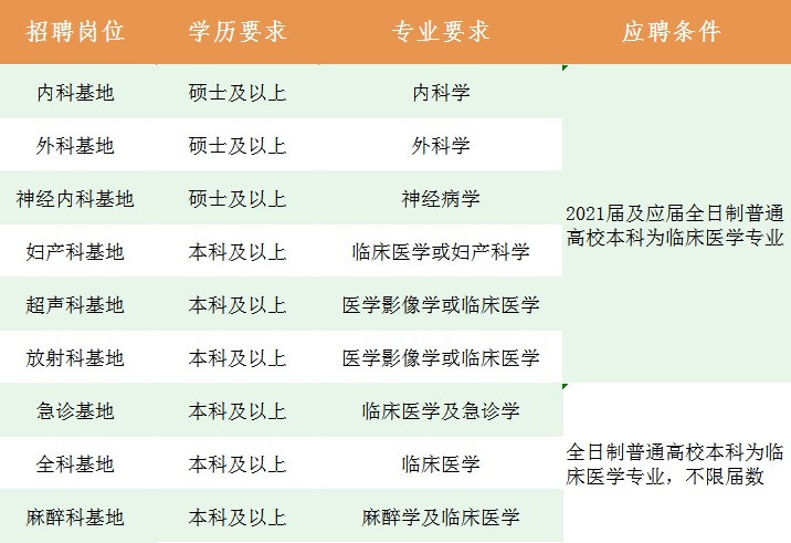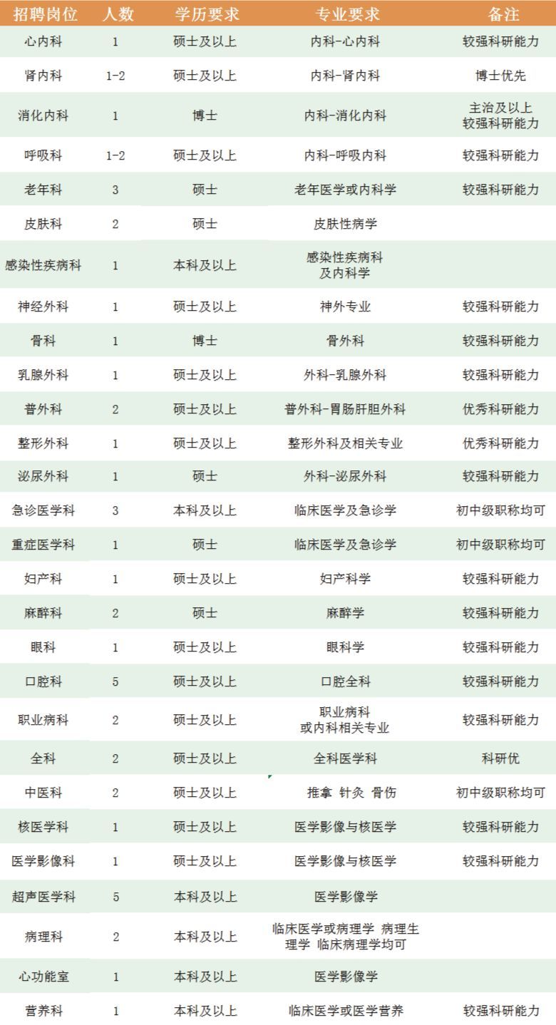 (有医师资格证、2010年后全日制医学院毕业生需要有住院医师规培证书,三甲医院工作经历优先)