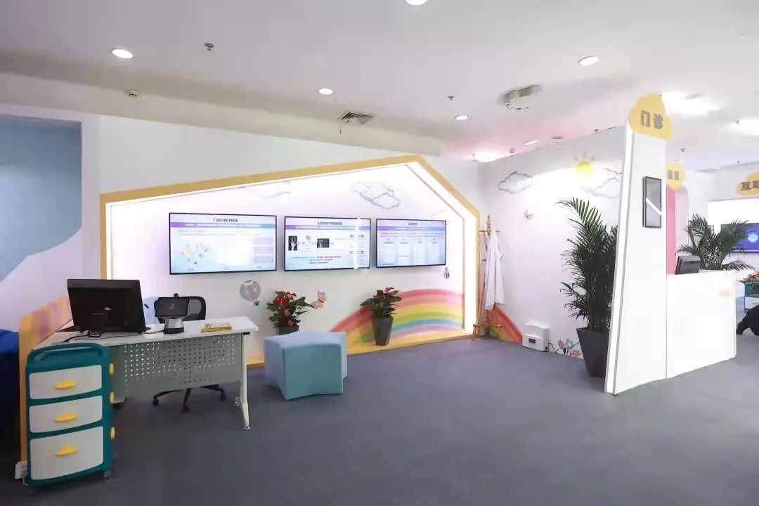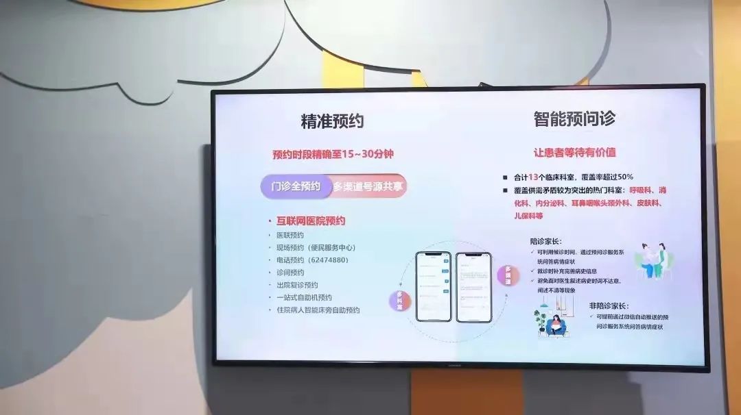这里就像个微缩版的医院门诊大厅。就诊之前,家长可体验直接在线开具血、尿、粪三大常规检验项目并进行移动支付,患儿做完检验后,再进入诊室,由医生查看常规检验单结果,从而减少检验前的就医环节,节省患者约20分钟就诊时间。候诊期间,患儿家长可在线通过问答互动的形式进行智能预问诊,提交患儿病史简介,同时医生会在线收到一份数字化病历报告,提前了解患儿病情,提高门诊工作效率和质量。儿童骨龄智能辅助检测和遗传病辅助诊断系统,可实现骨龄和疑难罕见病的快速诊断。此外,患儿可享受医嘱下达-药师审方-自助取号-药品冲配-患儿输液-输液巡视的一站式输液闭环管理服务。