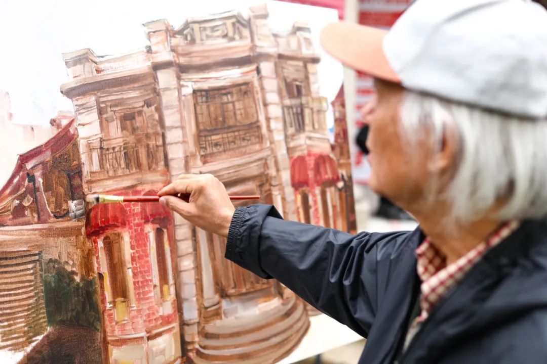 ▲浙江省油画家协会原副主席韩培生于上海邮政博物馆写生