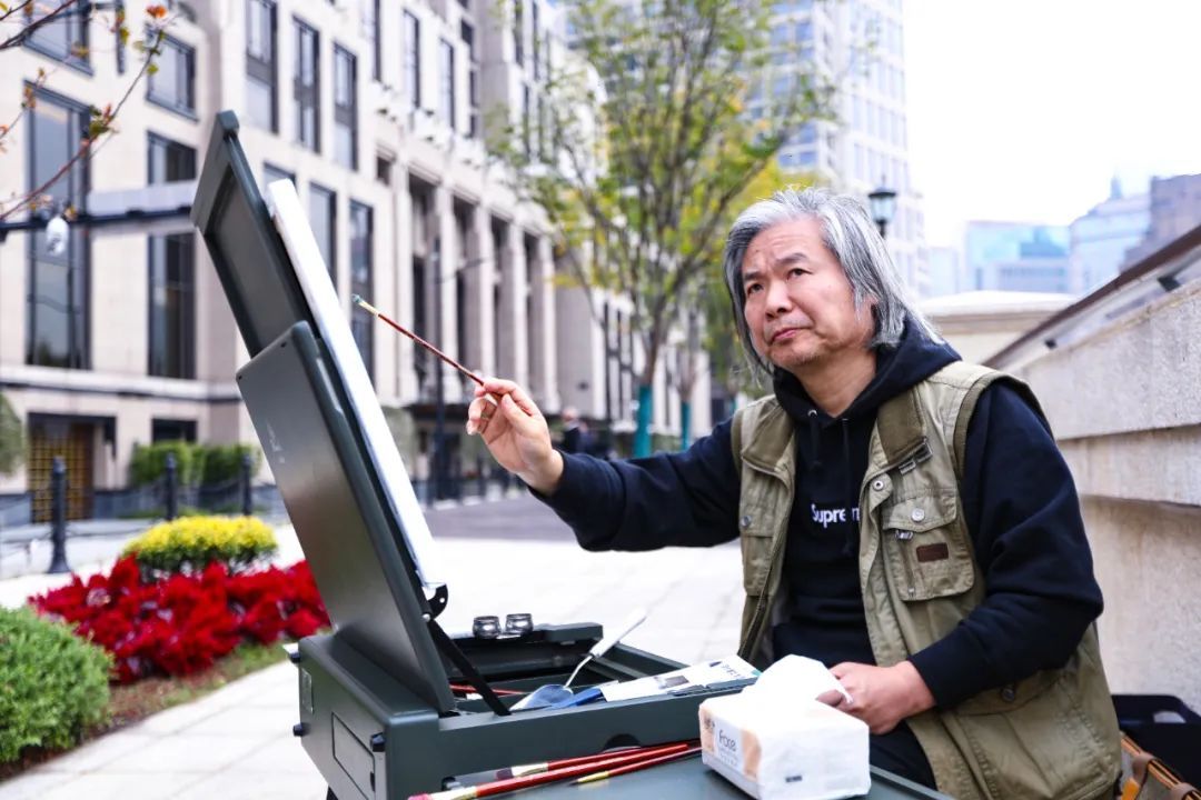 ▲苏州大学艺术学院教授戴家峰于上海大厦写生