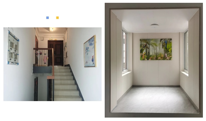 加装电梯的到来让13号楼从内到外焕然一新。借助社区美丽楼道项目,楼道环境得到了改善,墙面刷新,管线统一移位,显得干净又敞亮。特别是二楼的连廊平台,因为房屋结构问题没有设置出入口,这里成为了一个闲置角落,居民们自发在墙面挂上了装饰画,让原本平淡无奇的角落顿时充满了艺术氛围,成了一幅活生生的画中画。