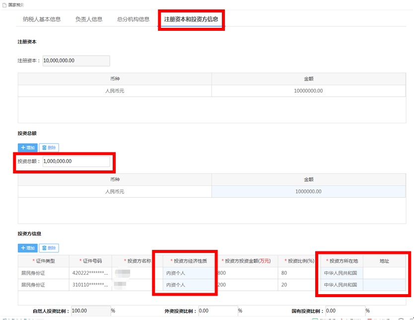 注册资本和投资方信息页签需维护投资人的经济性质、投资方所在地,对于中国国籍的投资人还需要填写其住所地址。