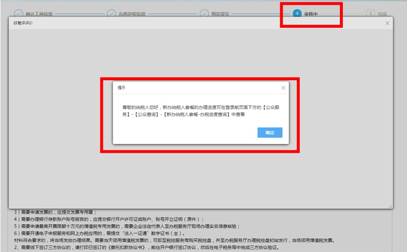 提交后出现“提示”框,且流程条会显示“审核中”,对符合条件的新办企业,可在受理后的当天办结相关涉税事项。收到手机短信息后,根据提示进行相关操作。