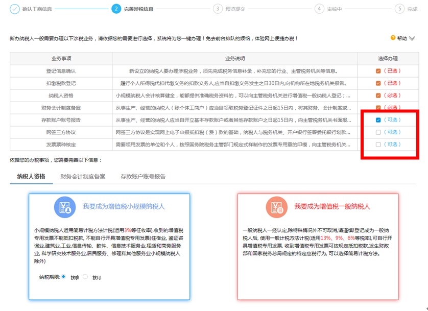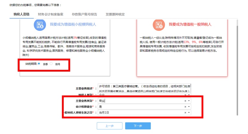 请根据需要选择成为“一般纳税人”或“小规模纳税人”,选择成为“一般纳税人”需要填报主营业务类别和一般纳税人资格生效之日,成为一般纳税人后适用一般计税方法计算缴纳增值税,可自主开具增值税专用发票,在收到增值税专用发票后可按规定抵扣增值税款,一般纳税人按月度进行增值税申报。