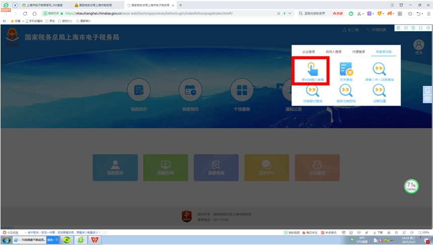 在上海市电子税务局首页右上角点击“登录”——“免登录功能”,选择“新办纳税人套餐”链接进入操作界面。