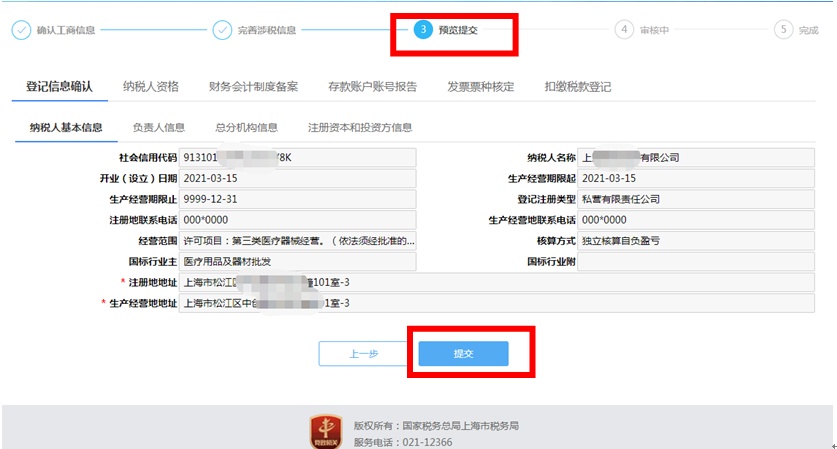 各页签信息填报完毕后点击“下一步”,进入预览提交页面。