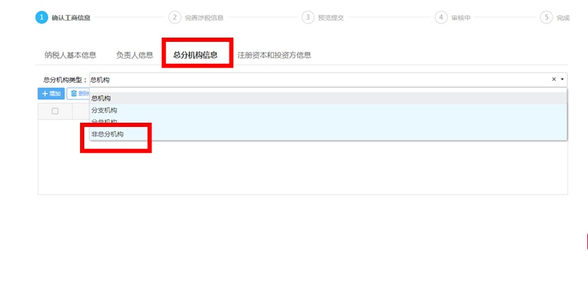 总分机构信息页签需填报总分机构类型信息,下拉菜单可以根据企业实际进行选择。