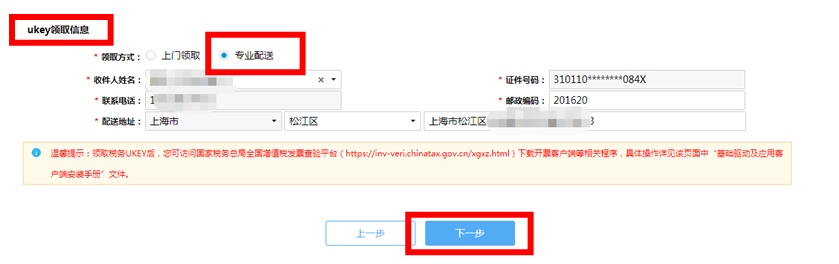 纳税人若在发票票种核定中选择了增值税发票,在发票票种核定页面下方有UKEY领取信息填写。税务部门会提供免费的税务UKEY供纳税人开票使用,纳税人可选择上门领取,或者专业配送,配送的收件人默认为企业三员之一,纳税人可选择修改配送地址。