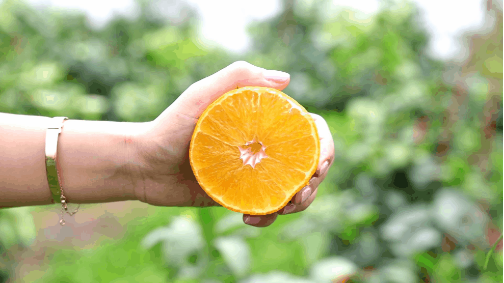 对半切开,马上就会有果汁溢出表面。用手一挤,一杯“纯手工鲜榨果汁”就出炉了。