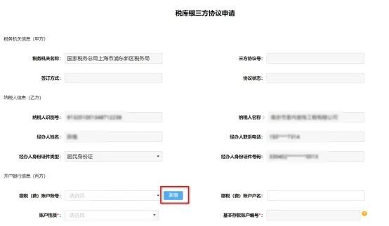 点击【手工录入银行账户信息】,系统跳转至税库银三方协议申请页面。系统自动带出税务机关信息(甲方)、纳税人信息(乙方)相关信息。用户可手工录入开户银行信息(丙方)信息。