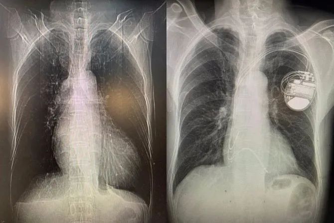 心血管内科孙冰主任医师、毛玉副主任医师和刘洋副主任医师在仔细研究病情后发现,张先生的心电图QRS波图形很宽,为完全性左束支阻滞图形,这意味着他的心脏内部电传导方式和正常心脏不同,他的左右心室和左心室内部的收缩是不同步的。QRS波越宽,心室内部电传导越慢,心脏收缩的同步性越差,心功能也越差。如果通过心脏起搏的方式纠正左束支传导阻滞,使QRS波变窄就能恢复心脏电传导的同步性,改善心功能。经医疗小组研究后决定以希浦系统起搏的方式为他植入三腔起搏器进行再同步化治疗。