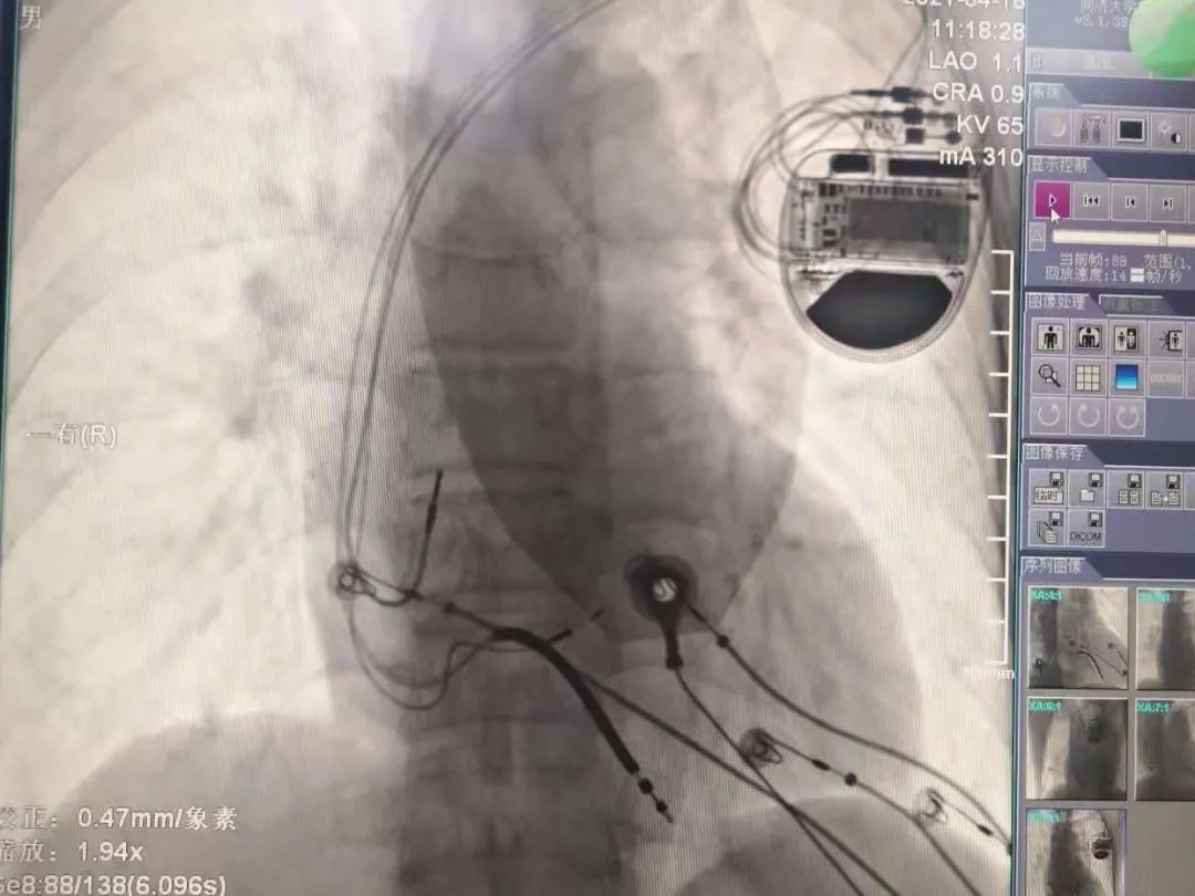 择日,孙冰主任医师和毛玉副主任医师所在的起搏团队为先生进行了起搏器植入手术。张先生植入的起搏器为三腔起搏器,共有三根导线经血管到达心脏,分别位于右心房、右心室和左束支。右心房、右心室得电极保证了心房心室收缩的同步性,并具有防治室速室颤的功能。而左束支电极可以纠正左束支传导阻滞,实现左室内部的收缩同步,改善心功能。经过精细定位和检测,左束支电极植入成功,起搏后可以看到张先生心电图的QRS波迅速变窄,标志左室收缩同步性的达峰时间和胸前导联QRS波移行也非常理想。手术很成功。术后心电图已经看不到原来宽宽的QRS波了,几乎与正常心电图完全一样。这意味着心脏电传导得到了改善,张先生的脸上也露出了笑容。