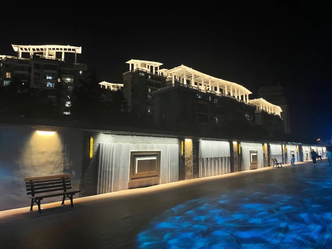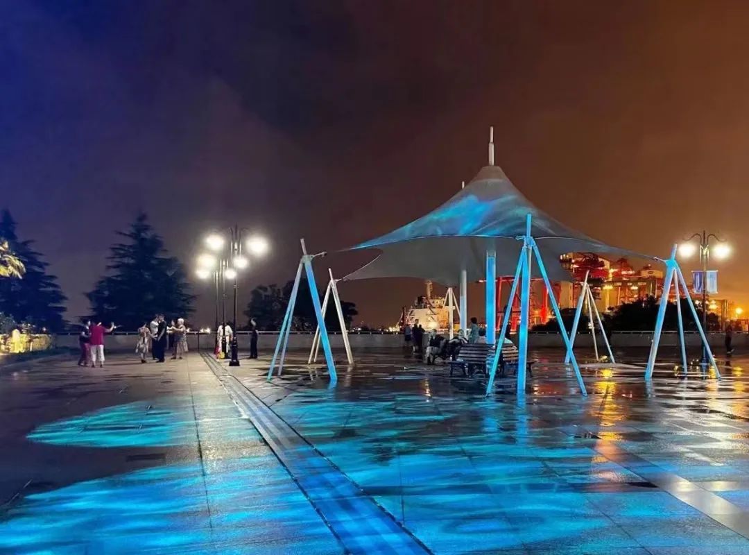 吴淞开埠广场增加互动性灯光小品,聚集了人气。地面增添投影,提升灯光整体氛围,展现了宝山百年开埠历史,提升了居民休憩空间品质。