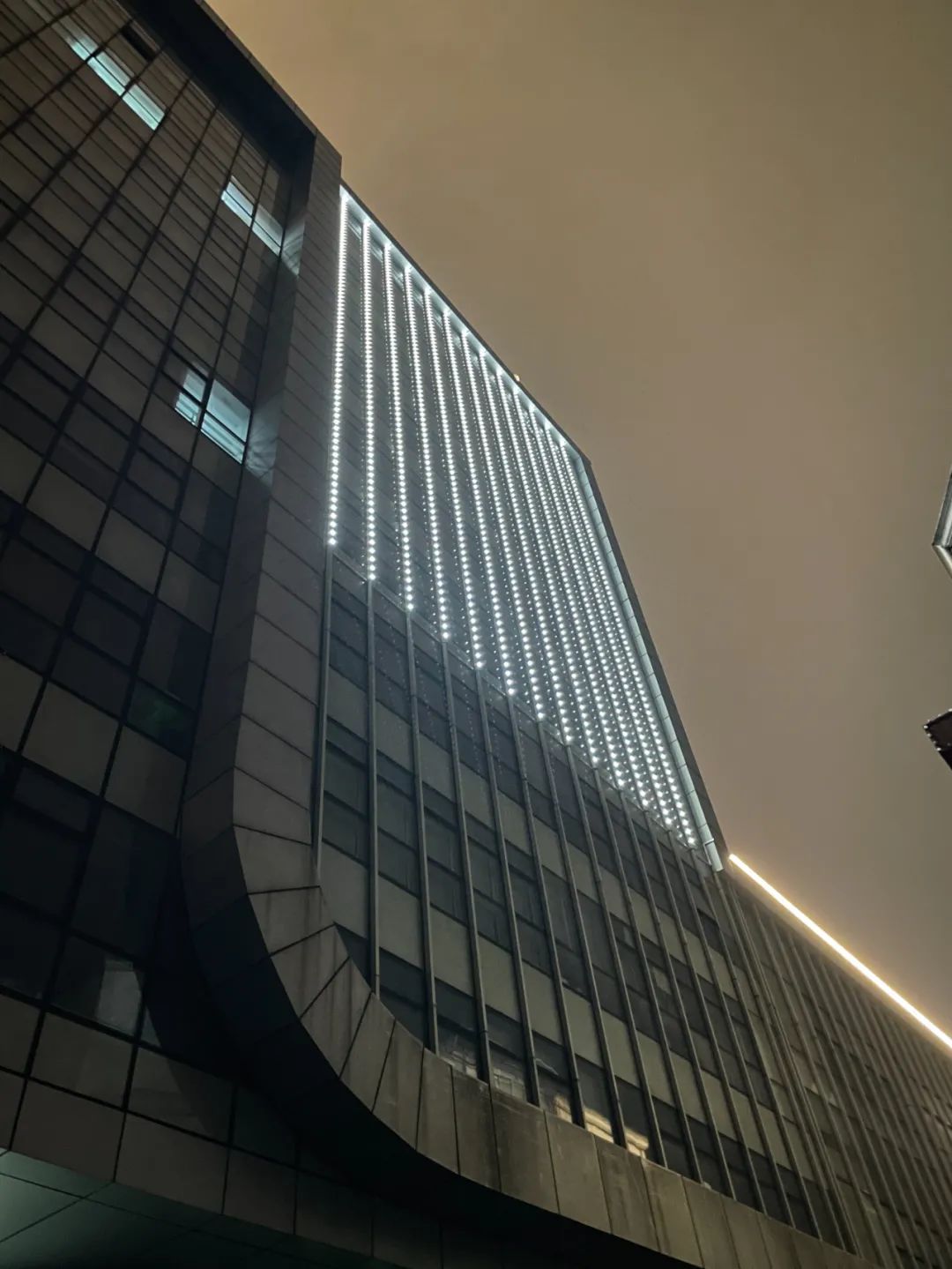 吴淞客运中心,采用与建筑幕墙结构贴合的夜景灯光,展现建筑流线感与横向张力,展现建筑体量感。