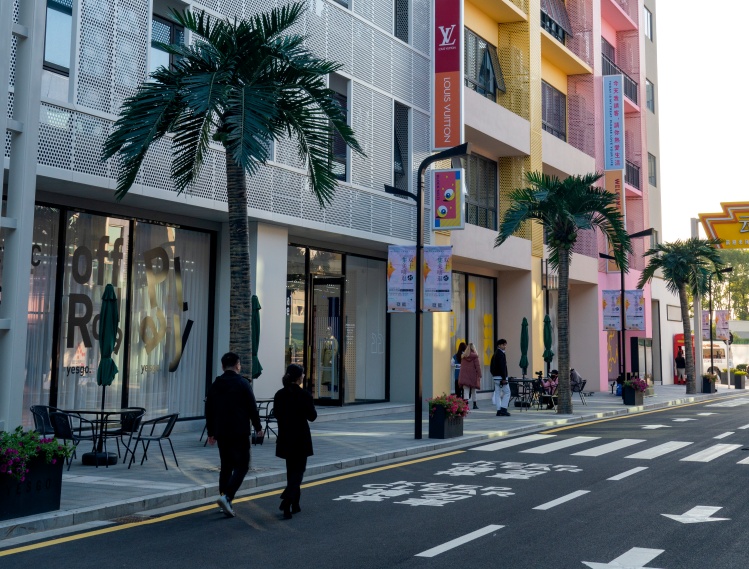 云裳谷时尚科技产业园,集年轻活力、时髦独特、有趣丰富、时尚创新于一体。走进云裳谷时尚科技产业园二期,超级出片的网红打卡街区,街区一步一景,道路入口处悬挂着复古的“云裳谷11号大街”牌子,两幢马卡龙色系的楼房映入眼帘,路边高大的椰子树充满热带气息,彩色路标与道路上的行驶指示牌显现着“文艺范儿”。