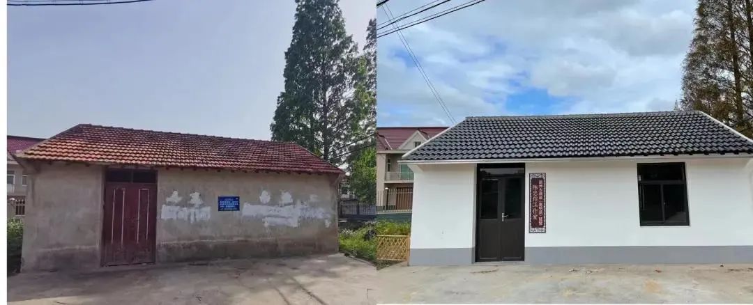 在天新村进村路上有一处废弃仓库,年久失修,内外墙面都已脱落,周边环境不尽如人意。今年正值天新村创建市级美丽乡村示范村,改建过后的废弃仓库便成为了村里的民乐传承基地。