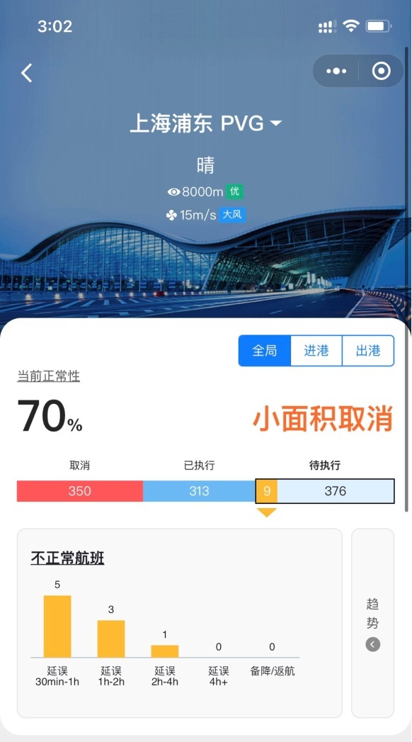 航线方面,当前京沪航线航班整体运行正常,并未受明显影响;穗沪航线3成以上航班被取消;深沪航线5成以上航班被取消。