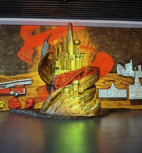 三楼序厅增设一组浮雕,并以此为背景制作了一部光影秀,展示上海消防与城市建设发展同频共振。