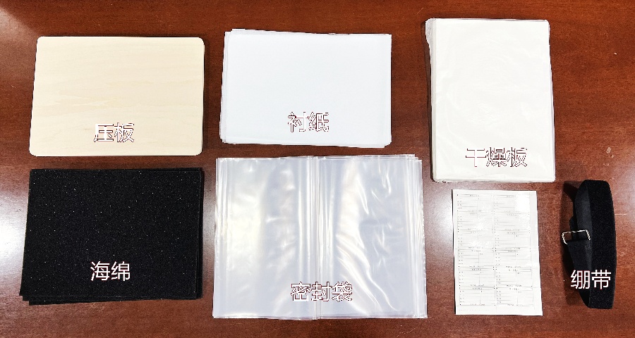 准备材料:压板、干燥板、衬纸、海绵、绷带和密封袋