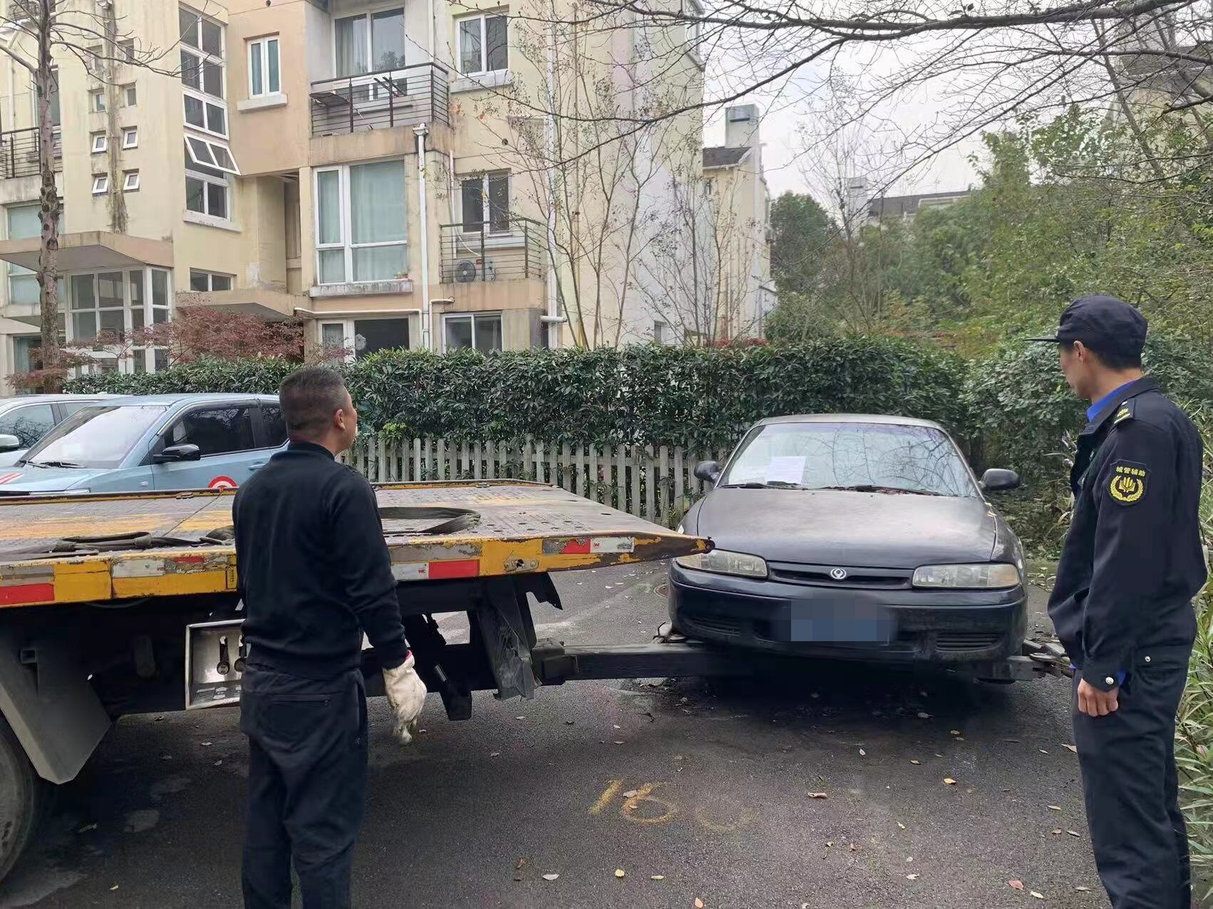 为回应群众呼声,11月29日,新桥镇综合行政执法队联合小区居委会、物业对这六辆“僵尸车”进行专项清理。“为小区居民做了件实事,缓解了我们的停车压力。”整治行动获得了小区居民的一致好评。