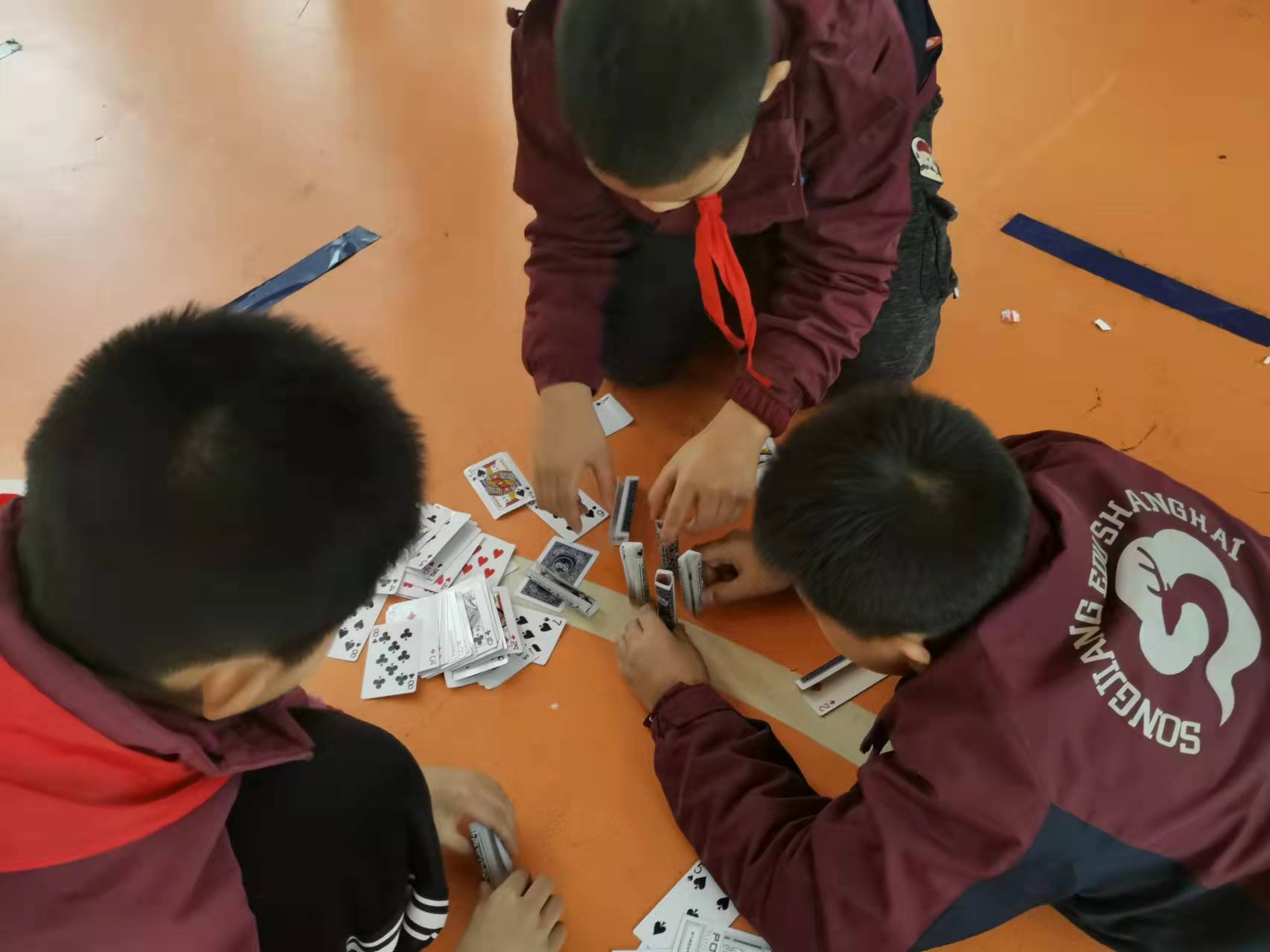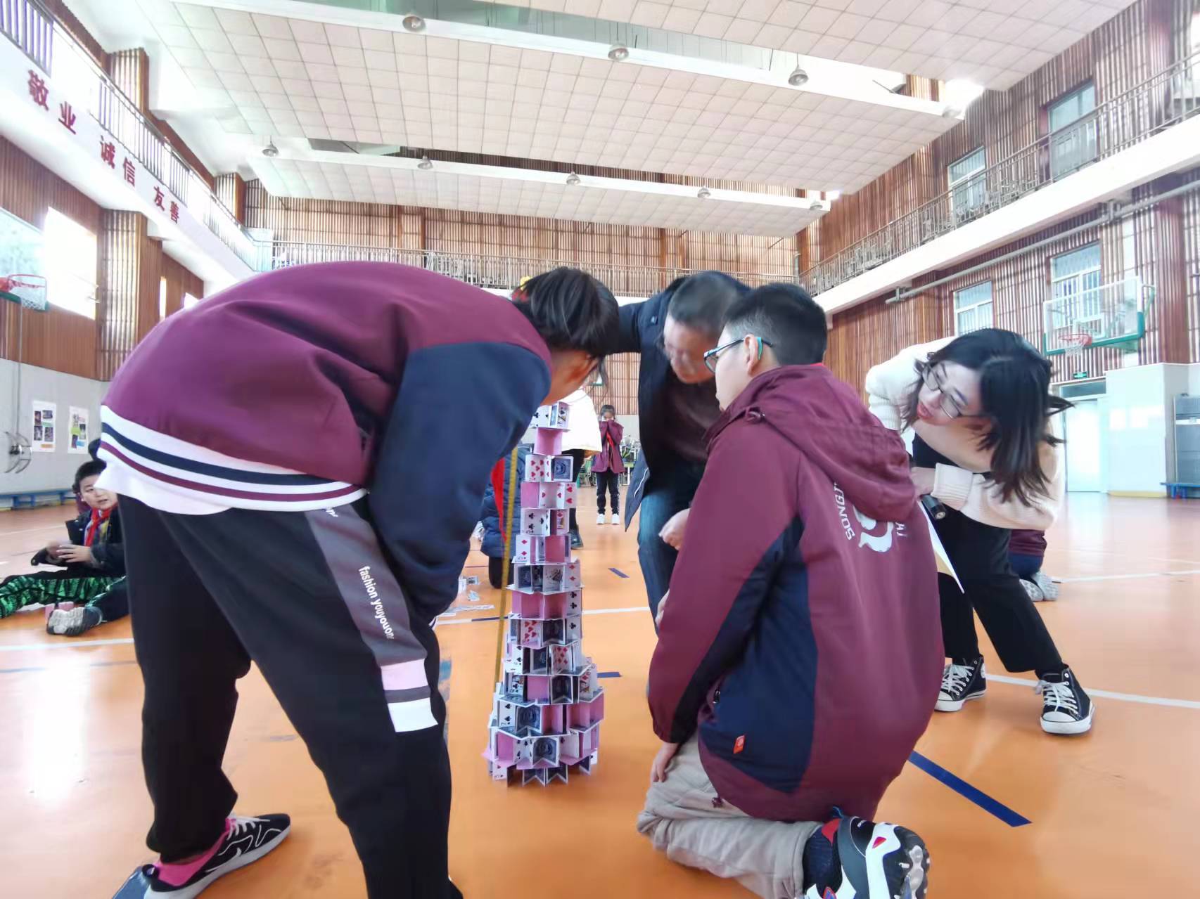 不能借助辅助工具,仅凭折、卷、插等方式,如何将轻飘飘的纸牌搭成兼具稳定性与高度的塔呢?“底座一定要稳,否则不能承重。”“对,最底层我们可以多用些纸牌。”……比赛还未正式开始,五(5)班学生叶智宇和小组成员杨嘉霖、尹子轩就聊起了攻略。