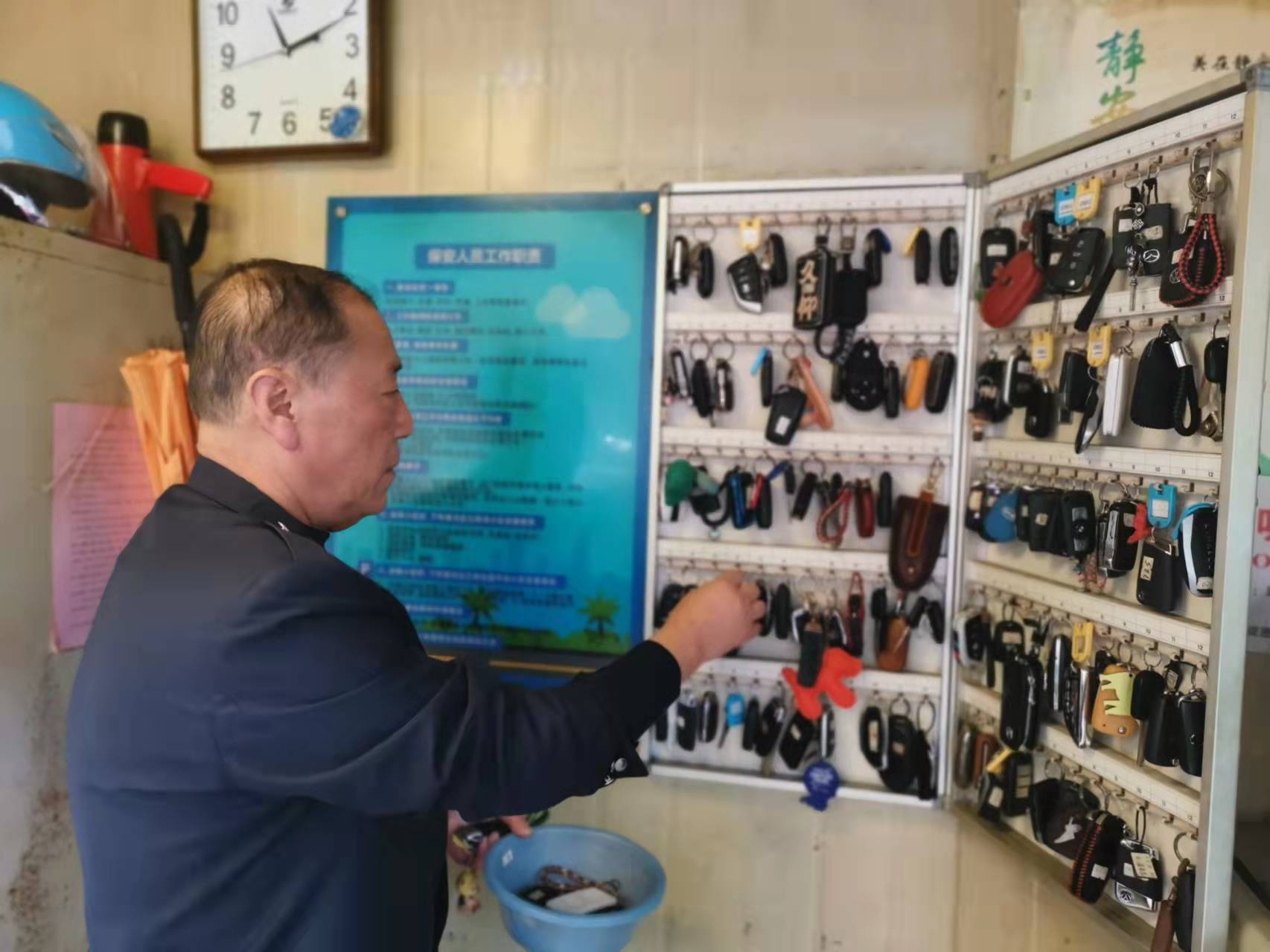 小区的安保室里,保安队长徐菊明早已将这么多的车钥匙与车主牢牢匹配在了脑子里,他还把层叠停车的区域用“三色桶”来区分:“这只桶是山墙里面的车钥匙,这个是凹塘里的,这个是三号楼对面的。居民如果要挪开山墙的车子,我就从这个桶里拿钥匙去开,如果他说是凹塘里的,我就拿凹塘桶里的钥匙。不管是普通车还是豪车,我都能挪好,业主也都比较满意。作为我来说,这份工作虽然蛮辛苦点,但能让居民满意,辛苦就辛苦点吧。”