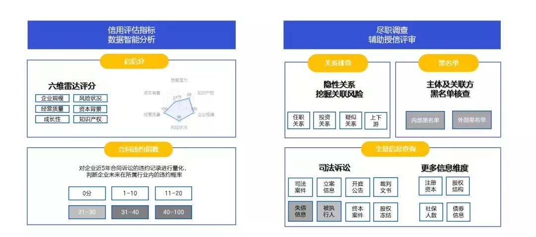 如:公司法务部门、信用部门甚至营销部门在客商准入审核时,需要负责客户的全面资信调查,并随时侦查客户信用变化及风险变化,建立和维护公司客户信息库。应收账款管理套件中“启信分”和“合同违约指数”功能,分别从企业综合评分和合同诉讼违约记录的量化分层维度,智能分析客户实力与历史风险发生概率,辅助企业对客户情况做第一轮初筛。对于符合资信初筛客户,仍需要深挖其关联风险或其他风险。借助“隐形关系挖掘”,可以在任职、投资关系基础上,增加疑似、上下游关系挖掘,涉及4大类18维度关系排查,同时借助“黑名单穿透”,可以对主体企业及关联企业、关联股东高管进行穿透核查,以标签和风险信号输出,基于关联关系防控风险传导。